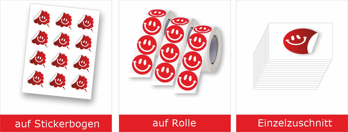 Sie haben die Wahl – auf Stickerbogen – auf Rolle oder als Einzelzuschnitt.